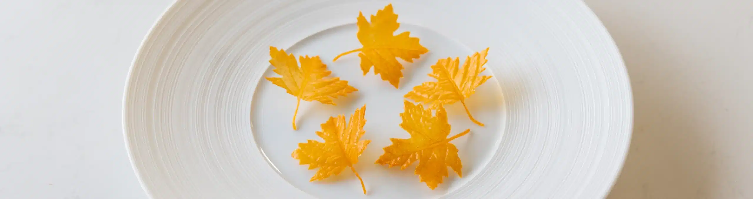 Mescolare le carote cotte con il succo d'arancia, lo zucchero isomalto, lo zucchero a velo e il glucosio. Frullare il tutto fino a ottenere un composto completamente liscio. Quindi trasferite il tutto in una ciotola e lasciate raffreddare in frigorifero. Una volta freddo, stendetelo su uno stampino a forma di foglia. Questo è quello dei fratelli Mold. Assicuratevi che sia distribuito in modo uniforme e poi rimuovete delicatamente lo stencil. Ora infornate a 120 gradi Celsius per 1 ora. Trascorsa l'ora, togliere delicatamente le foglie dal foglio e, quando sono ancora calde, modellarle con una pressa per foglie. A questo punto, conservatele asciutte e coperte per poterle utilizzare in seguito.