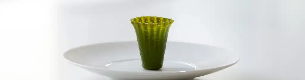 300 grams vegetable broth 20 grams spinach 40 grams green herbs (tarragon, basil & parsley) 50 grams flour 50 grams rice flour 25 gram corn starch 50 grams egg 3 grams salt First bring the vegetable broth to a boil and once it’s boiling add the spinach, dill & wasabi paste. Now directly cool this […]