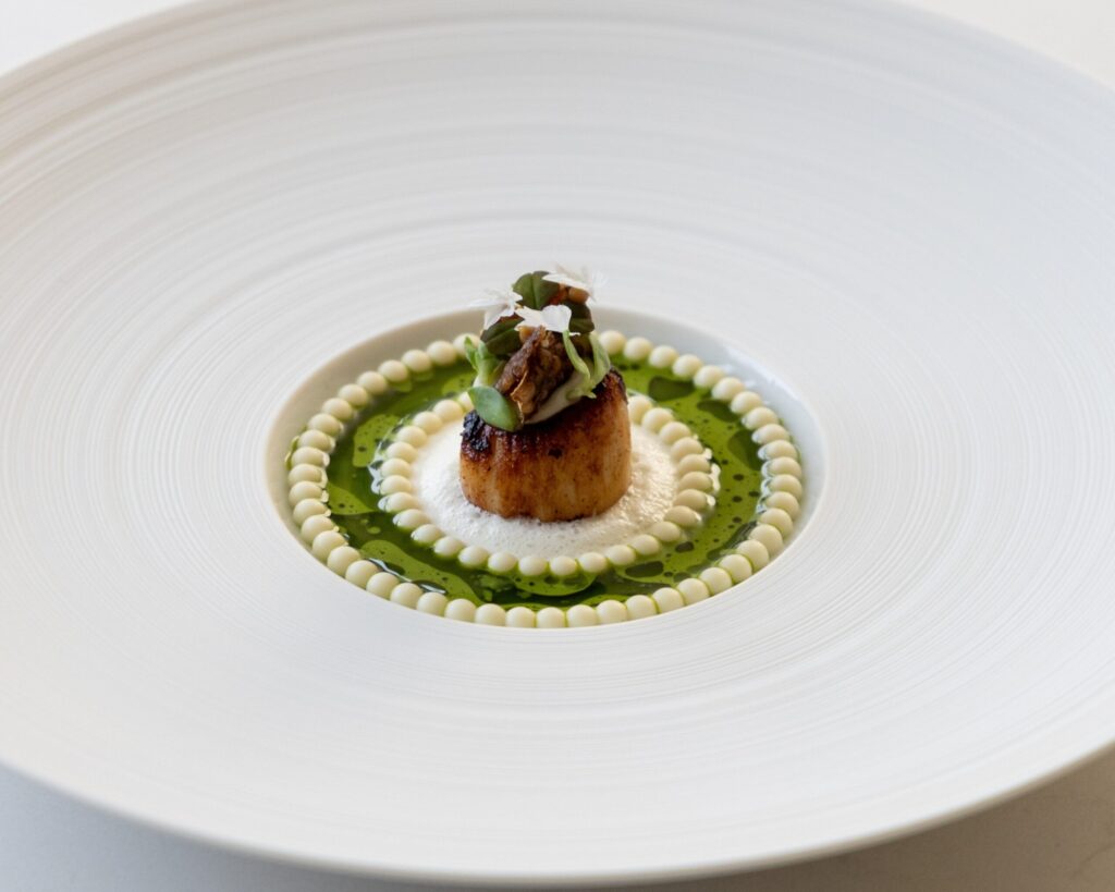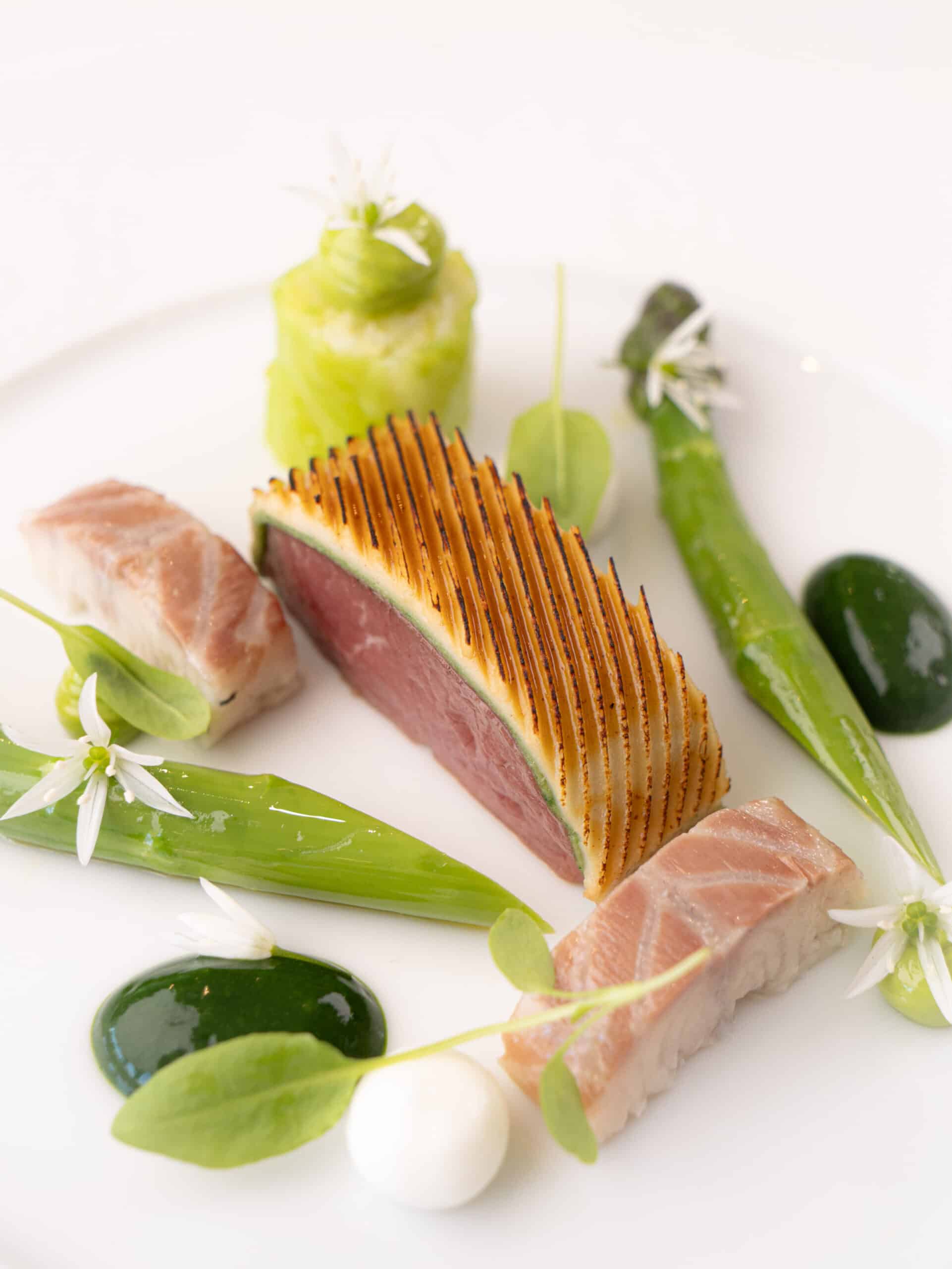Put all the ingredients in a blender and blend until smooth. Pass the mixture through a fine sieve and divide it into two portions. Mix some blanched wild garlic into one portion to give it a green tint. Fill the Fatcap Mold with the plain farce and place it in the oven at 100°C for a few minutes. Then add the green farce on top and return it to the oven for a few more minutes at 100°C. Enjoy!