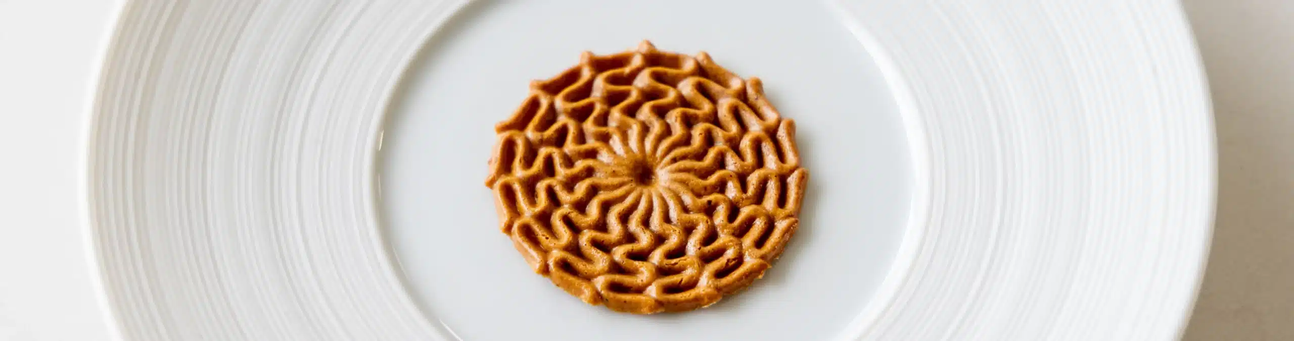 Mix the glucose with the water and the sugar. Caramelize this on a medium heat. Once it’s a golden caramel add the almonds and while mixing caramelize them for around 3 minutes till golden brown. Keep on heating the pan on a medium heat. Then pour it on a silicon sheet and let it cool down completely. Once cold transfer it into a blender and also add the egg white with the white chocolate. Blend this till smooth. This is going to take some time, but it’s super important it’s very smooth. Now spread it on a silicon sheet using a small circle stencil. Then remove the stencil and bake them at 160 degrees Celsius for 15 minutes. Now when still hot gently remove them from the sheet and directly press them between the press. I always heat up the press a bit as well to make sure they don’t break. Keep them dry and covered for later.